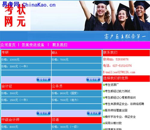 记者昨日登录这个名为“状元考网”(http://www.1860e.cn/)的网站,结果发现该网站竟公然叫嚣可代考公务员、会计证、托福、英语四六级、自考等各类考试,开价从数百元到上万元不等,并自称“枪手”资源很广,网络覆盖全国,同时承诺,考试没通过可退款。同时,该网站还明码标价,出售各类作弊设备。昨日,记者多次拨打该网站上的电话,但一直无人接听。